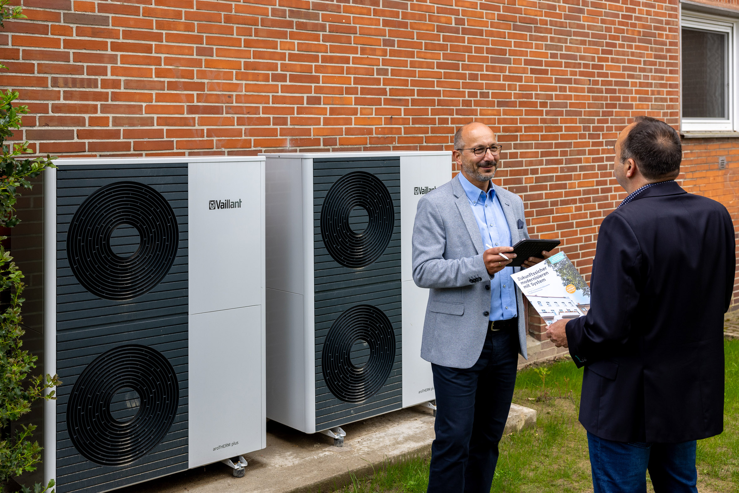 Für DOGEWO21-Projektleiter Andreas Wachter (li.) und Vaillant Key Account Manager Bau- und Wohnungswirtschaft Thorsten Baude ist die Erneuerung des Wärmeerzeugers im Dortmunder Objekt ein gutes Beispiel, wie zukunftsgerichtete Heiztechnik die Energiewende im Bestand auf wirtschaftliche Weise voranbringen kann: Nach VDI 4650 kommt die Kaskade auf einen Deckungsanteil von rund 80 Prozent!