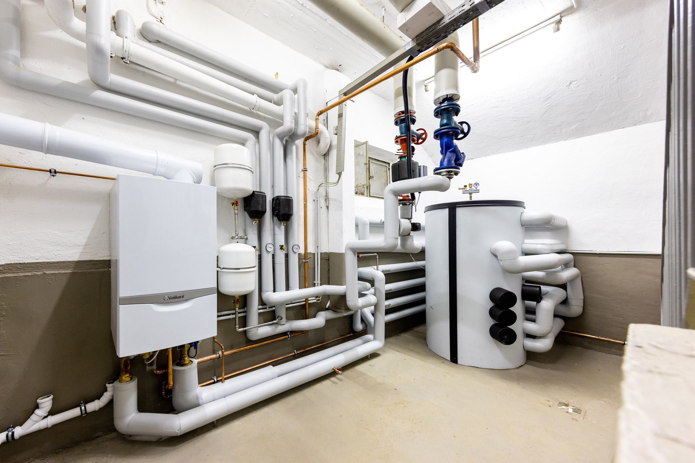 Als praxisgerechte Lösung, die zugleich für Versorgungssicherheit steht, entwickelte Heiztechnik-Spezialist Vaillant in enger Abstimmung mit DOGEWO21 eine Hybridlösung. Die Wärmegrundlast wird dabei über eine 2-er Luft/Wasser-Wärmepumpen-Kaskade aroTHERM plus mit zusammen knapp 25 kW Leistung abgedeckt. Ein zusätzliches, wandhängendes Gas-Brennwertgerät ecoTEC plus mit weiteren 60 kW Leistung schaltet sich automatisch auf, wenn zum Beispiel in besonders kalten Wintern Spitzenlasten abgefangen werden müssen: Im bivalent-parallelen Betrieb stehen dann, auf eine Norm-Außentemperatur von -8,6 °C bezogen, der Heizlast von 76 kW insgesamt 80 kW Wärmeleistung gegenüber. Im klimatisch eher gemäßigten Ruhrgebiet bedeutet das eine ausreichende Sicherheitsreserve. Vor allem, weil ein ebenfalls neu installierter Multifunktionsspeicher allSTOR mit 850 Liter Inhalt als Trennspeicher eine Energiereserve bildet, die für die Wärmepumpe optimale Laufzeiten und bei kurzfristigem Wetterwechsel für hinreichende Versorgungssicherheit der Bewohner und Bewohnerinnen steht, auch ohne dass das Gas-Brennwertgerät in Aktion treten müsste.